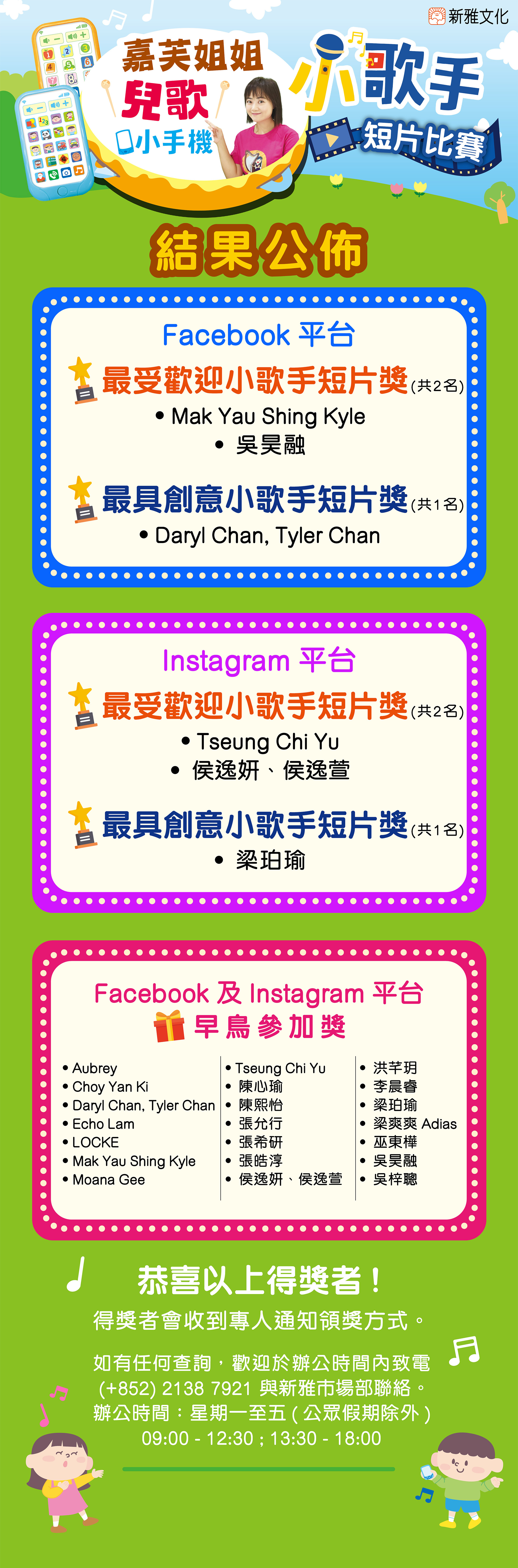 得獎名單公佈:嘉芙姐姐兒歌小手機‧小歌手短片比賽